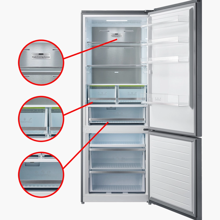 Ο ψυγειοκαταψύκτης διαθέτει Τεχνολογία Full NoFrost με σύστημα ψύξης Metal-Cooling για γρηγορότερη και πιο αποδοτική ψύξη, 2 συρτάρια φρούτων και λαχανικών με δυνατότητα ρύθμισης υγρασίας και γυάλινο καπάκι καθώς και χώρο ημικατάψυξης χωρητικότητας 44lt (fresh zone compartment) στην συντήρηση για την καλύτερη συντήρηση νωπών κρεάτων και ψαριών.